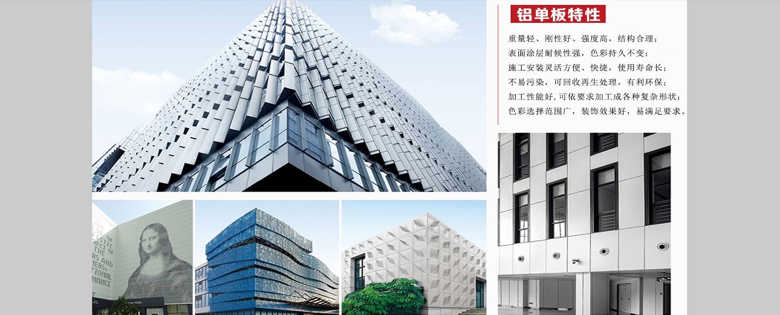 鋁單板工程案例可應用于:建筑物外墻、梁柱、門頭、陽臺、雨棚、廣告牌、室內(nèi)建筑裝飾、商業(yè)大樓、別墅…